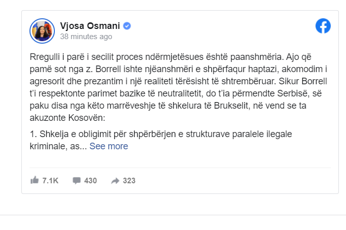 Presidentja Osmani në postimin e saj në Facebook ka thënë se se sikur Borrell t’i respektonte parimet bazike të neutralitetit, do t’ia përmendte Serbisë, së paku disa nga këto marrëveshje të shkelura të Brukselit, në vend se ta akuzonte Kosovën.
