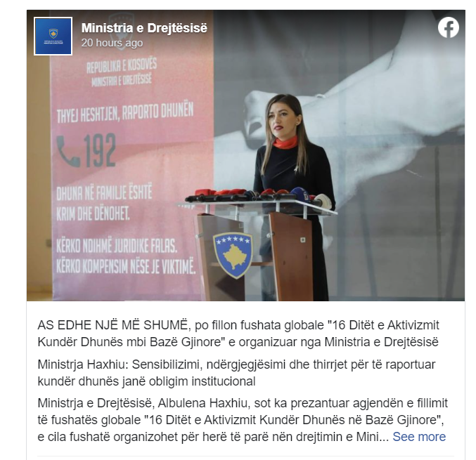 “Dhuna ndaj grave dhe vajzave po ndodhë çdo ditë në hapësira të ndryshme, dhe ky fenomen ka shënuar rritje, Ministria e Drejtësisë, konsideron se sensibilizimi i qytetarëve, ndërgjegjësimi dhe thirrjet për raportim janë obligim institucional. Dhuna nuk është çështje private dhe raportimi është hapi i parë për adresim. Andaj, për këto arsye Ministria e Drejtësisë, për herë të parë ka marrë rolin drejtues dhe koordinues të kësaj fushate në Kosovë”, tha ministrja Haxhiu në konferencë për media.