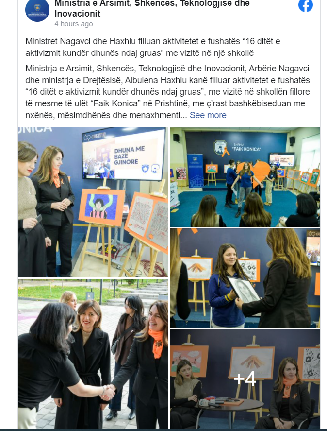 Ministrja e Arsimit, Shkencës, Teknologjisë dhe Inovacionit, Arbërie Nagavci dhe ministrja e Drejtësisë, Albulena Haxhiu kanë filluar aktivitetet e fushatës “16 ditët e aktivizmit kundër dhunës ndaj gruas”, me vizitë në shkollën fillore të mesme të ulët “Faik Konica” në Prishtinë, me ç’rast bashkëbiseduan me nxënës, mësimdhënës dhe menaxhmentin e shkollës për rëndësinë e kultivimit të vlerave, qëndrimeve dhe marrëdhnënieve të shëndosha ndërpersonale.