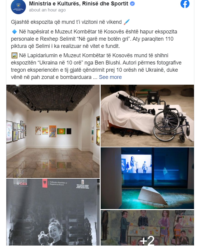 Në Lapidariumin e Muzeut Kombëtar të Kosovës mund të shihni ekspozitën “Ukraina në 10 orë” nga Ben Blushi. Autori përmes fotografive tregon eksperiencën e tij gjatë qëndrimit prej 10 orësh në Ukrainë, duke vënë në pah zonat e bombarduara të Irpinit dhe Borodyankës si dhe Kievin, qytetin që jeton në paqe dhe njëkohësisht në panik.