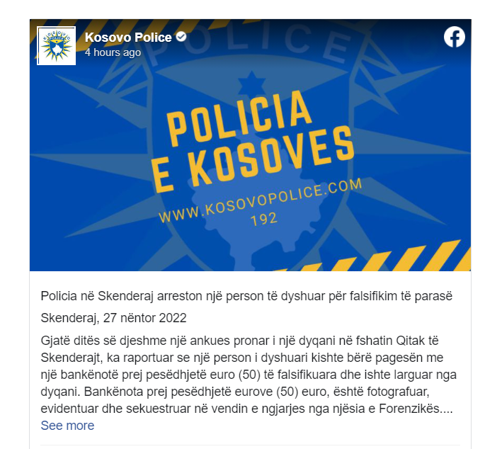 Të gjitha veprimet hetimore janë paraqitur prokurorit të rastit. Rasti është iniciuar dhe është duke u hetuar për veprën penale ‘Falsifikim i parasë”. Pas intervistimit, me urdhër të prokurorit të rastit, i dyshuari është liruar për procedurë të rregullt, thuhet në postimin në Facebook të PK-së.