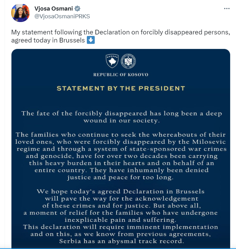 Presidentja Osmani në postimin e tij në Twitter ka thënë se shpresojmë që Deklarata e rënë dakord sot në Bruksel do të hapë rrugën për njohjen e këtyre krimeve dhe për drejtësinë. Por mbi të gjitha, një moment lehtësimi për familjet që kanë pësuar dhimbje dhe vuajtje të pashpjegueshme. Prandaj kjo deklaratë do të kërkojë zbatim të menjëhershëm dhe për këtë, siç e dimë nga marrëveshjet e mëparshme, Serbia ka një histori të paimagjinueshme.
