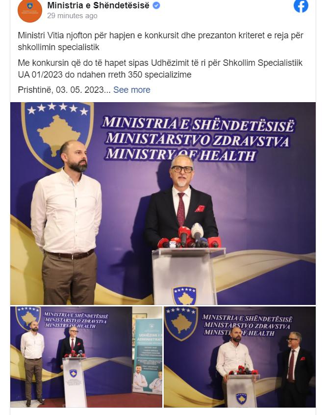Ministri i Shëndetësisë, Dr. Arben Vitia, sot në një konferencë për media, bashkë me drejtuesin e Bordit për Shkollim Specialistik, dr. Edmond Haliti, prezantuan hapjen e konkursit për shkollimin specialistik, bazuar në Udhëzimin e ri Administrativ (UA) Nr. 01/2023 për shkollim specialstik.