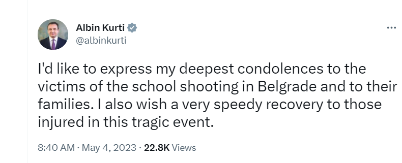 Kryeministri i Kosovës, Albin Kurti ka shpreh ngushëllime familjarëve të viktimave pas të shtënave në shkollë në Beograd ku një 14-vjeçar vrau tetë nxënës dhe rojën e sigurisë.