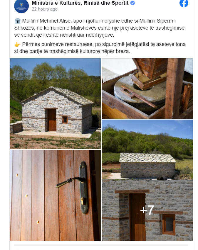 Ministria e Kulturës ka bërë të ditur se po vazhdohet me restaurimet e trashëgimisë kulturore në gjithë Kosovën. Mulliri i Mehmet Alisë, apo i njohur ndryshe edhe si Mulliri i Sipërm i Shkozës, në komunën e Malishevës është një prej aseteve të trashëgimisë së vendit që i është nënshtruar ndërhyrjeve.