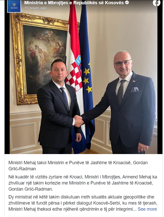 Në kuadër të vizitës zyrtare në Kroaci, ministri i Mbrojtjes, Armend Mehaj ka zhvilluar një takim kortezie me ministrin e Punëve të Jashtme të Kroacisë, Gordan Grlić-Radman.