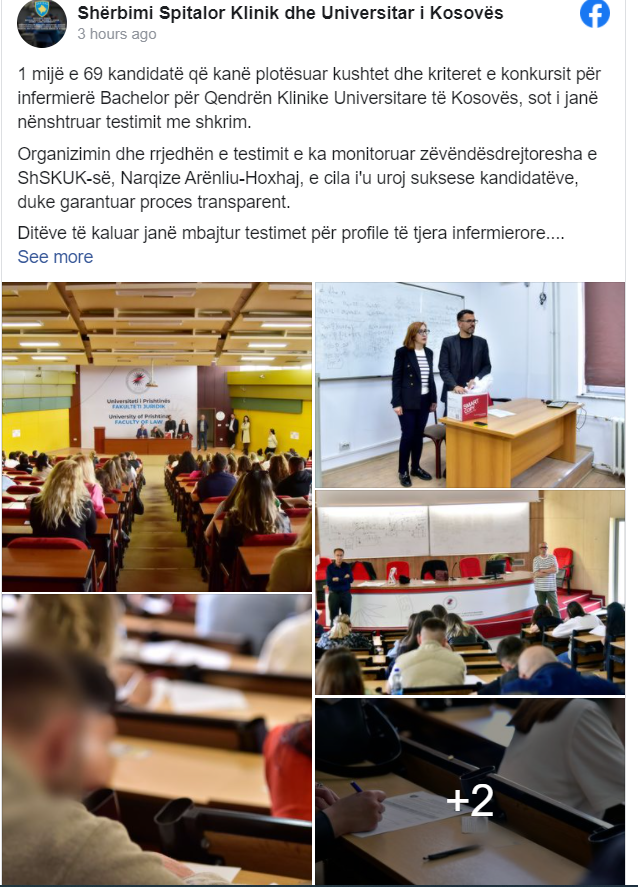 Shërbimi Spitalor Klinik dhe Universitar i Kosovës ka bërë të ditur se 1 mijë e 69 kandidatë që kanë plotësuar kushtet dhe kriteret e konkursit për infermierë Bachelor për Qendrën Klinike Universitare të Kosovës, sot i janë nënshtruar testimit me shkrim.