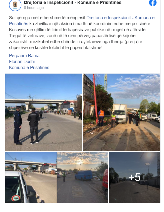 Drejtoria e Inspekcionit- Komuna e Prishtinës ka bërë të ditur se sot që nga orët e hershme të mëngjesit ka zhvilluar një aksion të madh në koordinim me Policinë e Kosovës me qëllim të lirimit të hapësirave publike në rrugët në afërsi të Tregut të veturave.