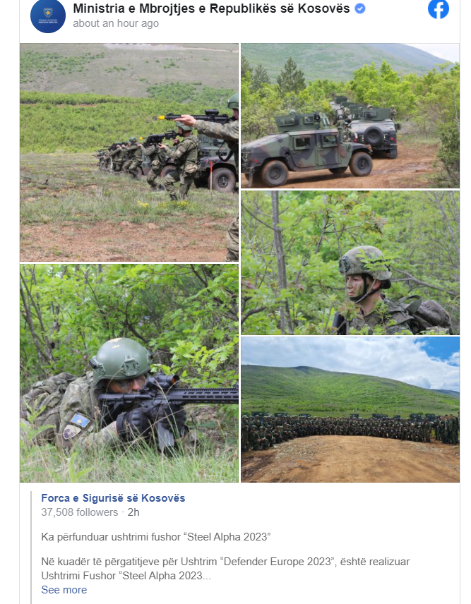 Ushtria e Republikës së Kosovës ka përfunduar me sukses ushtrimim fushor “Steel Alpha 2023”Ky ushtrim është zhvilluar në kuadër të përgatitjeve për Ushtrim “Defender Europe 2023”, ku janë validuar Kompania A dhe Togut IVR nga Regjimenti i Dytë i Forcave Tokësore.