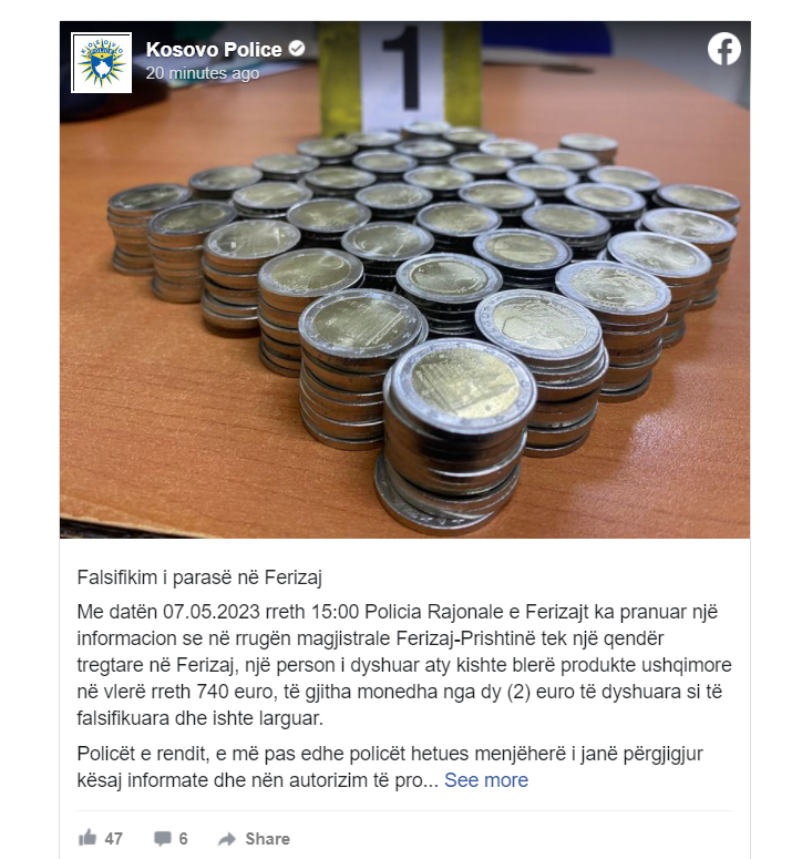 Policia Rajonale e Ferizajt ka pranuar një informacion se në rrugën magjistrale Ferizaj-Prishtinë tek një qendër tregtare në Ferizaj, një person i dyshuar aty kishte blerë produkte ushqimore në vlerë rreth 740 euro, të gjitha monedha nga 2 euro të dyshuara si të falsifikuara dhe ishte larguar.