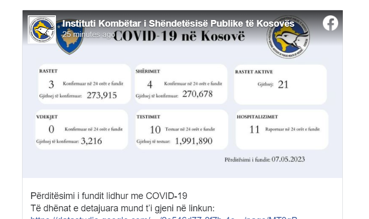 Instituti Kombëtar i Shëndetësisë së Kosovës përmes postimit në rrjetin social Facebook, ka publikuar rastet e të infektuarve me COVID-19, më 08.05.2023.
