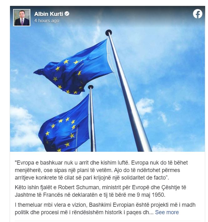 Kryeministri i Kosovës, Albin Kurti ka uruar 9 Majin – Ditën e Evropës duke thënë se më afër dhe rrugës për në Bashkimin Evropian, këtë vit kemi edhe më shumë arsye për të shënuar Ditën e Evropës.