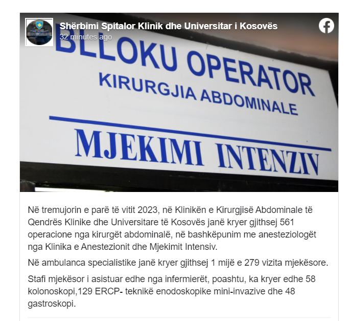 Shërbimi Spitalor Klinik dhe Universitar i Kosovës bën të ditur se në tremujorin e parë të vitit 2023, në Klinikën e Kirurgjisë Abdominale të Qendrës Klinike dhe Universitare të Kosovës janë kryer gjithsej 561 operacione nga kirurgët abdominalë, në bashkëpunim me anesteziologët nga Klinika e Anestezionit dhe Mjekimit Intensiv.
