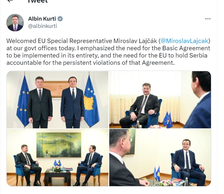 Kryeministri Kurti në postimin e tij në Twitter ka kërkuar që BE-ja ta mbajë Serbinë përgjegjëse për shkeljet e vazhdueshme të marrëveshjes së arritur mes Kosovës dhe Serbisë.