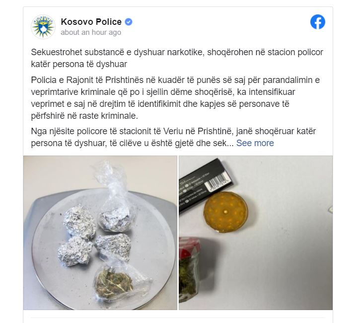 Nga njësite policore të stacionit të Veriu në Prishtinë, janë shoqëruar katër persona të dyshuar, të cilëve u është gjetë dhe sekuestruar sasi të substancave narkotike që dyshohet të jenë të llojeve: mariuhanë dhe kokainë.