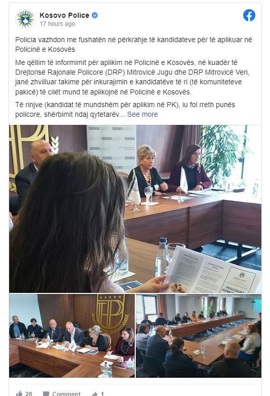 Me qëllim të informimit për aplikim në Policinë e Kosovës, në kuadër të Drejtorisë Rajonale Policore (DRP) Mitrovicë Jugu dhe DRP Mitrovicë Veri, janë zhvilluar takime për inkurajimin e kandidatëve të ri (të komuniteteve pakicë) të cilët mund të aplikojnë në Policinë e Kosovës.