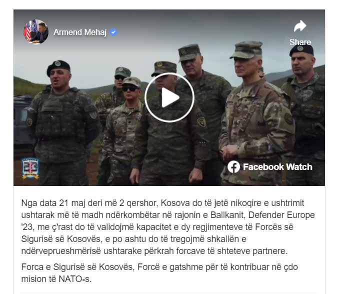 Ministri i Mbrojtjes, Armend Mehaj në postimin e tij në Facebook ka thënë se do të validojmë kapacitet e dy regjimenteve të Forcës së Sigurisë së Kosovës, e po ashtu do të tregojmë shkallën e ndërveprueshmërisë ushtarake përkrah forcave të shteteve partnere.