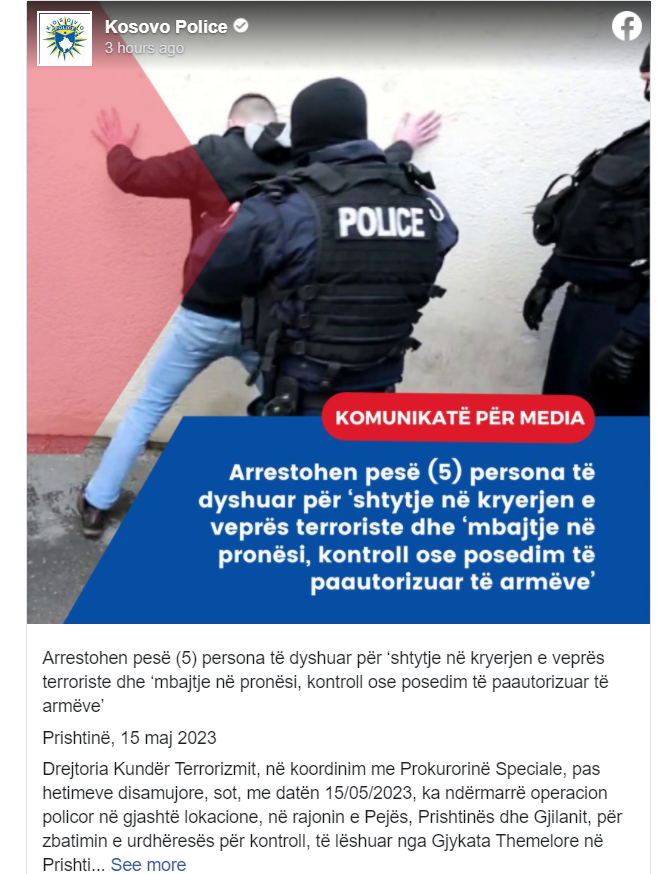 Si rezultat i këtij operacioni, nën dyshimin e kryerjes së veprave penale ‘shtytje në kryerjen e veprës terroriste, sipas nenit 134 të KPRK-së’ dhe ‘mbajtje në pronësi, kontroll ose posedim të paautorizuar të armëve’, sipas nenit 366 të KPRK-së, janë arrestuar pesë persona të dyshuar (L. B., B. V., E. B., A. H. dhe A. S.), ndaj të cilëve janë duke vijuar procedurat ligjore.