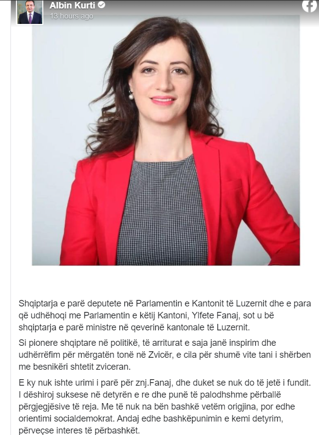 Kryeministri Albin Kurti në postimin e tij në Facebook ka thënë se si pionere shqiptare në politikë, të arriturat e saja janë inspirim dhe udhërrëfim për mërgatën tonë në Zvicër, e cila për shumë vite tani i shërben me besnikëri shtetit zviceran.