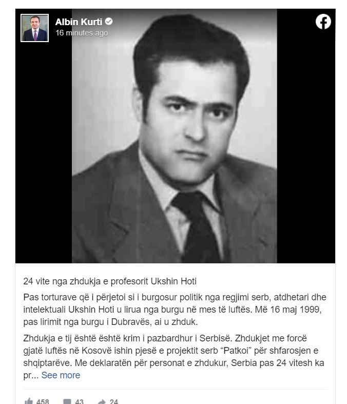 Kreministri Kurti në postimin e tij në Facebook ka thënë se pas 24 viteve të zhdukjes së profesorit të së drejtës ndërkombëtare Ukshin Hoti, e kujtojmë dhe mbetet i paharruar për përkushtimin e pashembullt, thellësinë e mendimit dhe madhështinë e thjeshtësisë së tij ku me mungesën e madhe për të, nderojmë jetën dhe veprën e Ukshin Hotit.