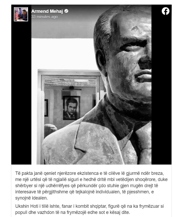 Ministri i Mbrojtjes, Armend Mehaj në postimin e tij në Facebook ka thënë se Ukshin Hoti i tillë ishte, fanar i kombit shqiptar, figurë që na ka frymëzuar si popull dhe vazhdon të na frymëzojë edhe sot e kësaj dite.