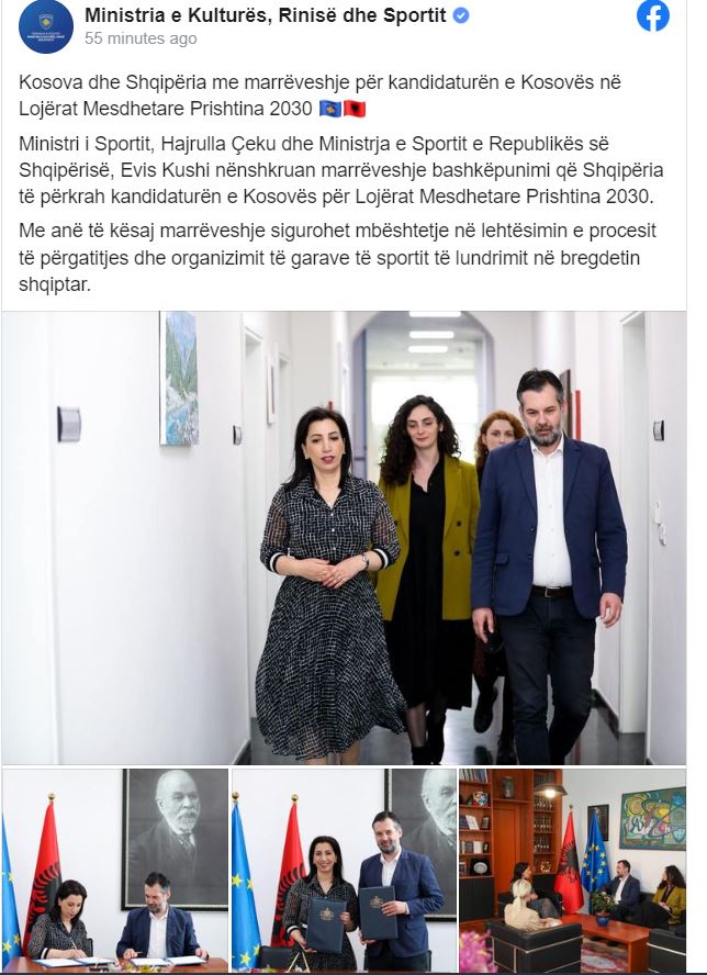 Ministri i Sportit të Kosovës, Hajrulla Çeku dhe ministrja e Sportit e Republikës së Shqipërisë, Evis Kushi nënshkruan marrëveshje bashkëpunimi që Shqipëria të përkrah kandidaturën e Kosovës për Lojërat Mesdhetare Prishtina 2030.