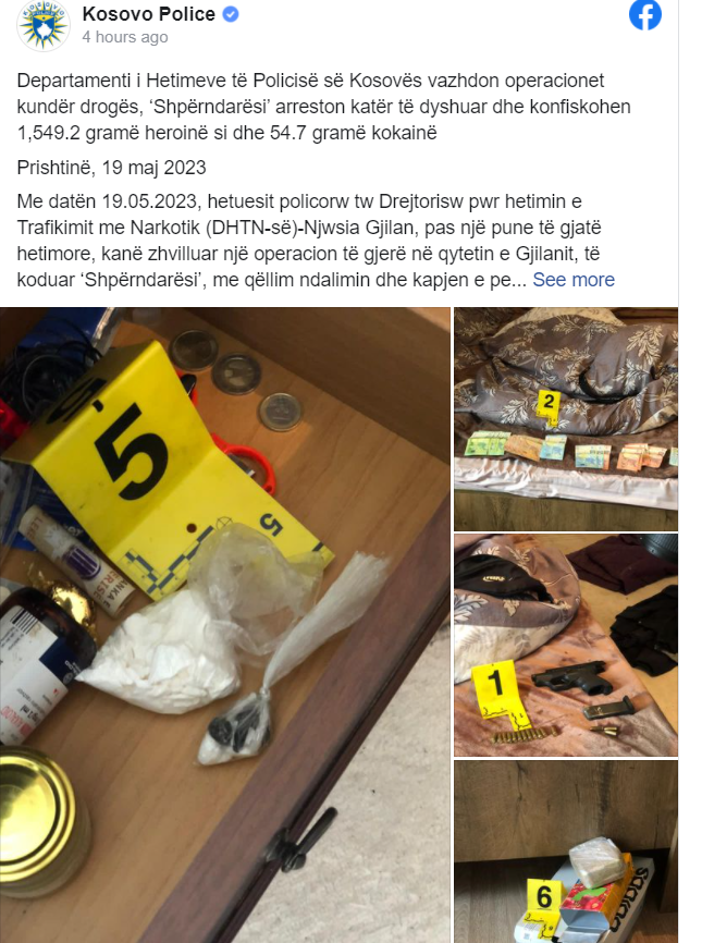 Në konsultim me prokurorin kompetent, pas intervistimit katër të dyshuarit e lart-cekur ndalohen për 48 orë dhe rasti vazhdon të hetohet nga njësitet kompetente të antidrogës, thuhet në postimin në Facebook të PK-së.