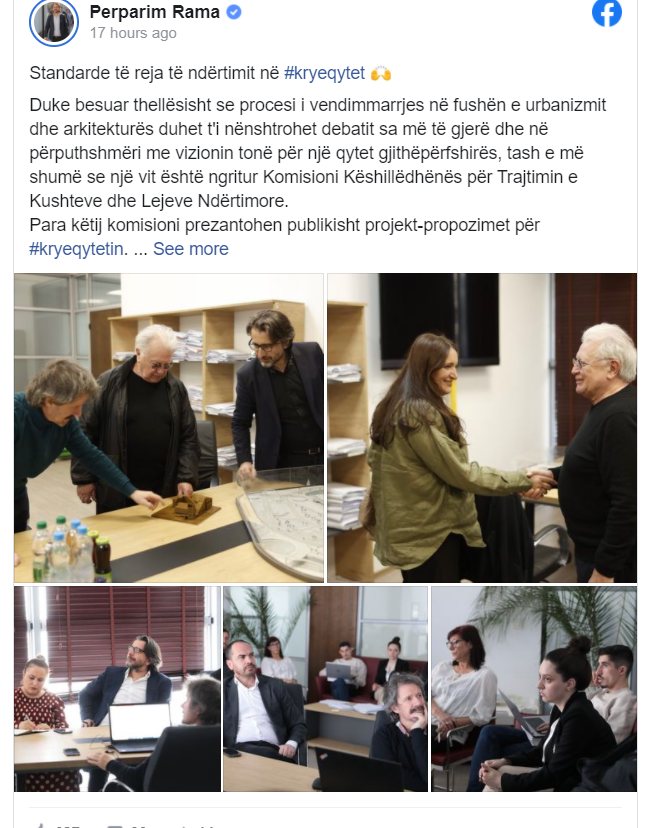 Duke besuar thellësisht se procesi i vendimmarrjes në fushën e urbanizmit dhe arkitekturës duhet t’i nënshtrohet debatit sa më të gjerë dhe në përputhshmëri me vizionin tonë për një qytet gjithëpërfshirës, tash e më shumë se një vit është ngritur Komisioni Këshillëdhënës për Trajtimin e Kushteve dhe Lejeve Ndërtimore, para këtij komisioni prezantohen publikisht projekt-propozimet për kryeqytetin.