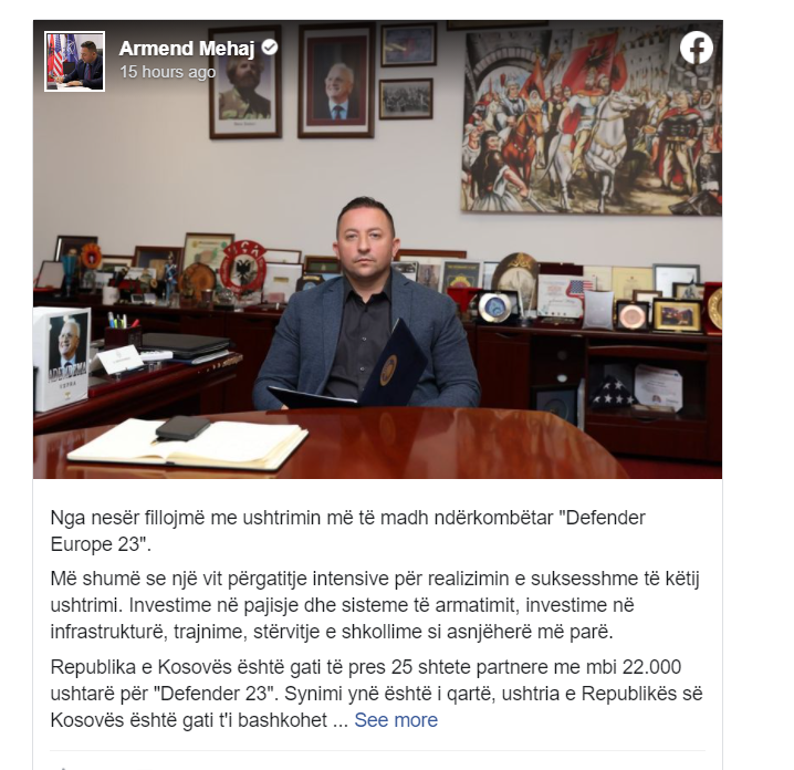 Mehaj në postimin e tij në Facebook ka thënë se Republika e Kosovës është gati të pres 25 shtete partnere me mbi 22.000 ushtarë për “Defender 23”.