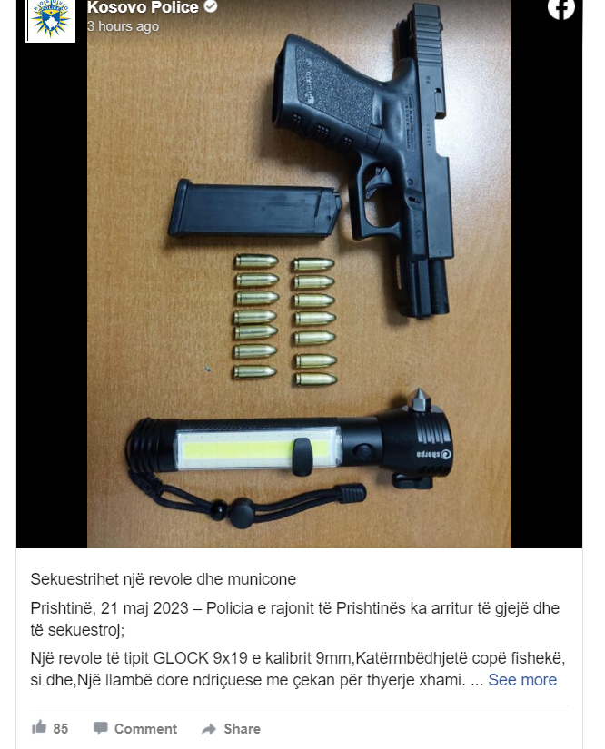Ndaj të dyshuarit B. B, mashkull, 31 vjeç, shtetas i Republikës së Kosovës, me rekomandimin e prokurorit të shtetit është iniciuar hetim në drejtim të veprës penale “Mbajtje në pronësi kontroll ose posedim të pa autorizuar të armës”, dhe i njëjti është proceduar më tej, thuhet në postimin në Facebook të PK-së.