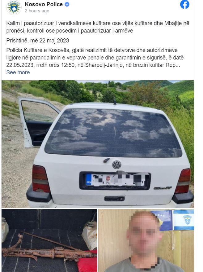 Policia e Kosovës ka ndërmarr veprimet e nevojshme ligjore, arma është konfiskuar dhe pas konsultimit me prokurorin ndaj të dyshuarit është iniciuar lënda në procedurë të rregullt për ”Kalim të pa autorizuar të vijës kufitare” dhe “Mbajtja në pronësi, kontroll ose posedim të paautorizuar të armëve”, thuhet në postimin në Facebook të PK-së.