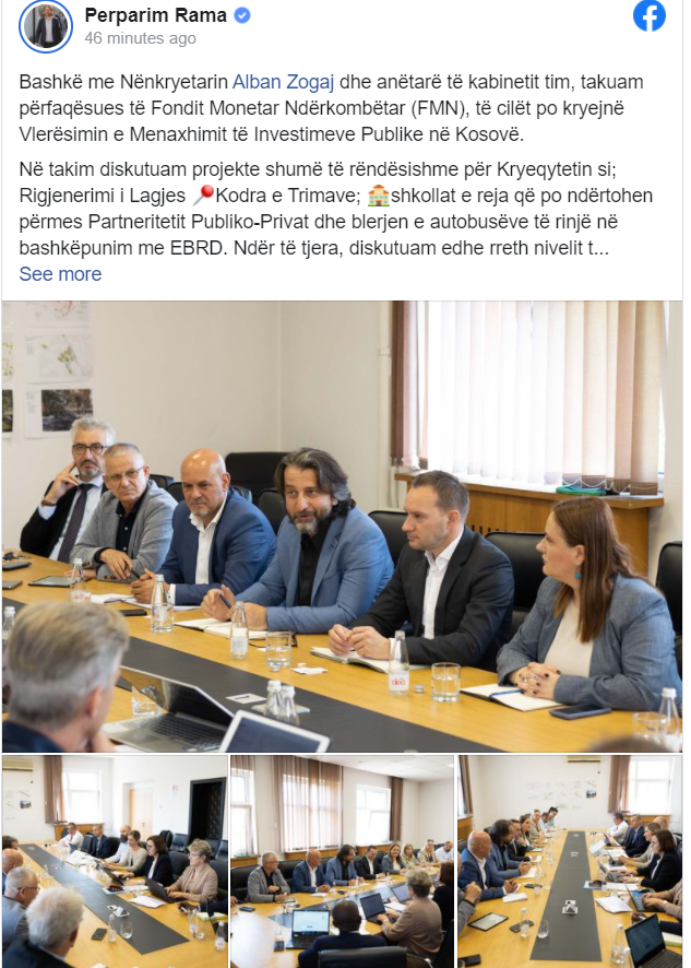 Kryetari i Komunës së Prishtinës, Përparim Rama bashkë me nënkryetarin Alban Zogaj dhe anëtarë të kabinetit kanë takuar përfaqësues të Fondit Monetar Ndërkombëtar (FMN), të cilët po kryejnë vlerësimin e menaxhimit të investimeve publike në Kosovë.