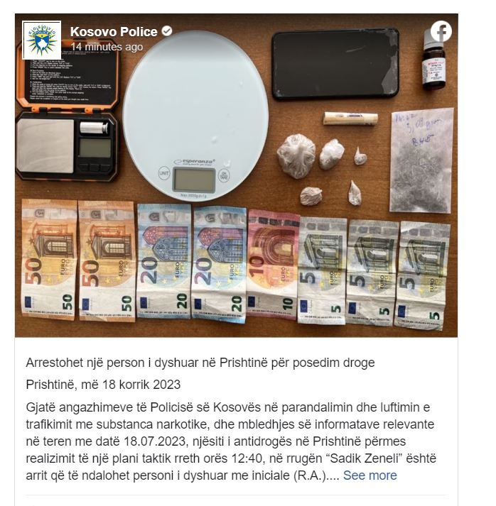 Gjatë angazhimeve të Policisë së Kosovës në parandalimin dhe luftimin e trafikimit me substanca narkotike, dhe mbledhjes së informatave relevante në teren me datë 18.07.2023, njësiti i antidrogës në Prishtinë përmes realizimit të një plani taktik rreth orës 12:40, në rrugën “Sadik Zeneli” është arrit që të ndalohet personi i dyshuar me iniciale (R.A.).