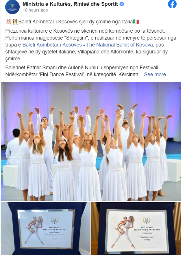 Ministria e Kulturës, Rinisë dhe Sportit ka njoftuar se performanca magjepsëse “Shtegtim”, e realizuar në mënyrë të përsosur nga trupa e Baletit Kombëtar e Kosovës -Tha National Ballet of Kosova pas shfaqjeve në dy qytetet italiane, Villapiana dhe Altomonte, ka siguruar dy çmime.
