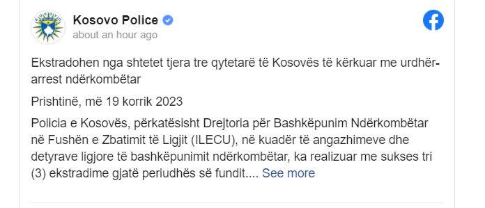 Policia e Kosovës në kuadër të Drejtorisë për Bashkëpunim Ndërkombëtar në Fushën e Zbatimit të Ligjit (ILECU), ka avancuar bashkëpunimin ndërkombëtar me institucionet e zbatimit të ligjit të shteteve tjera, dhe angazhimet e tilla me sjelljen para drejtësisë së personave të kërkuar me urdhër-arrest ndërkombëtar do të vazhdojnë në frymën e besimit dhe bashkëpunimit edhe në të ardhmen, thuhet në postimin në Facebook të PK-së.