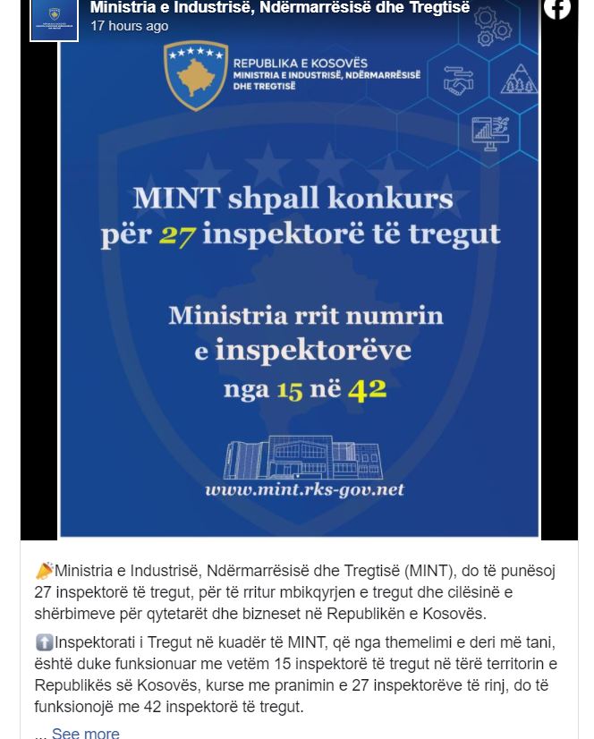 Kjo është një mundësi e mirë për të filluar një karrierë në fushën e inspektimit të tregut dhe të zhvillimit profesional, prandaj MINT inkurajon të gjithë aplikuesit potencial që plotësojnë kualifikimet minimale, të aplikojnë, thuhet në postimin në Facebook të MINT-it.