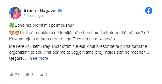 Nagavci në postimin e saj në Facebook ka thënë se me këtë ligj, kanë rregulluar ofrimin e edukimit cilësor në të gjitha format e organizimit të edukimit për më të vegjëlit tanë prej lindjes deri në moshën 6 vjeçare dhe me ligjin e ri, Edukimi Parafillor bëhet i obliguar.