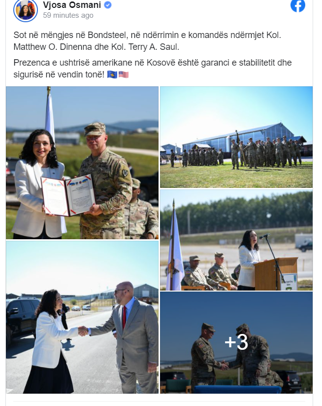 Presidentja Osmani në postimin e saj në Facebook ka thënë se falënderova kolonel Dinenna për shërbimin e tij të jashtëzakonshëm në Kosovë dhe i urova një mirëseardhje të përzemërt kolonelit Saul.