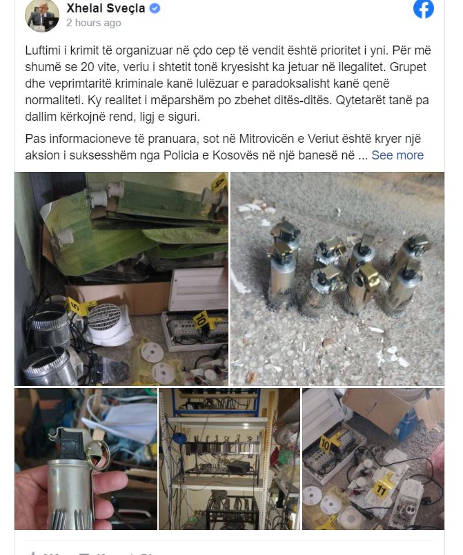 Ministri i Punëve të Brendshme, Xhelal Sveçla ka bërë të ditur se në Mitrovicën e Veriut është kryer një aksion i suksesshëm nga Policia e Kosovës në një banesë në rrugën e Kolashinit, saktësisht në katin 11 tek tre rrokaqiejt. Në banesë janë gjetur dhe konfiskuar 60 kartela grafike, makina antiminer S9, 13 ventilatorë, poça elektrikë që shfrytëzohen për rritjen e bimëve të kanabisit, llampë elektrike për laborator, municion 51 fishekë dhe 8 mjete shpërthyese të improvizuara.