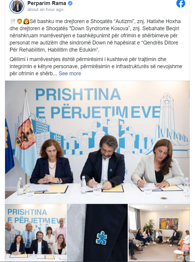Kryetari i Komunës së Prishtinës, Përparim Rama së bashku me drejtoren e Shoqatës “Autizmi”, Hatixhe Hoxha dhe drejtoren e Shoqatës “Down Syndrome Kosova”, Sebahate Beqiri kanë nënshkruar marrëveshjen e bashkëpunimit për ofrimin e shërbimeve për personat me autizëm dhe sindromë Down në hapësirat e “Qendrës Ditore Për Rehabilitim, Habilitim dhe Edukim”.