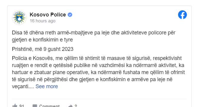 Policia e Kosovës, me qëllim të shtimit të masave të sigurisë, respektivisht ruajtjen e rendit e qetësisë publike në vazhdimësi ka ndërmarrë aktivitet, ka hartuar e zbatuar plane operative, ka ndërmarrë fushata me qëllim të ofrimit të sigurisë në përgjithësi dhe gjetjen e konfiskimin e armëve pa leje në veçanti.