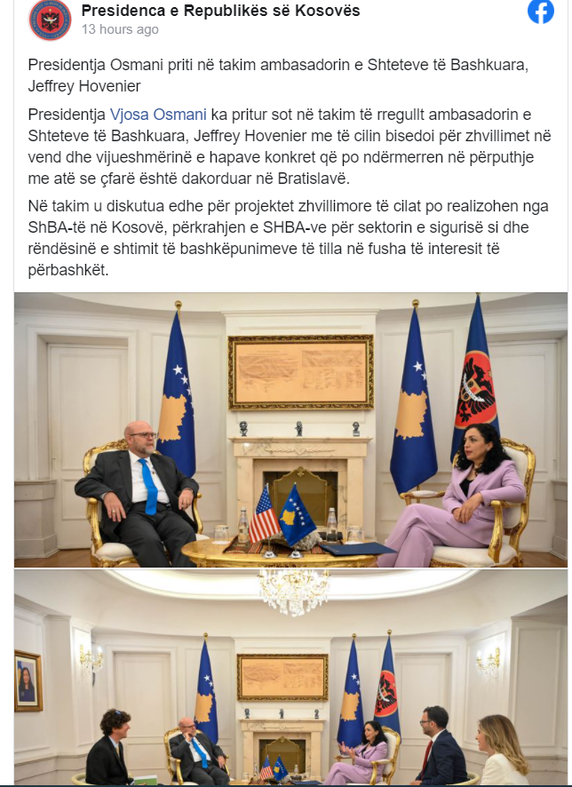 Presidentja Vjosa Osmani ka pritur sot në takim të rregullt ambasadorin e Shteteve të Bashkuara, Jeffrey Hovenier me të cilin bisedoi për zhvillimet në vend dhe vijueshmërinë e hapave konkret që po ndërmerren në përputhje me atë se çfarë është dakorduar në Bratislavë.