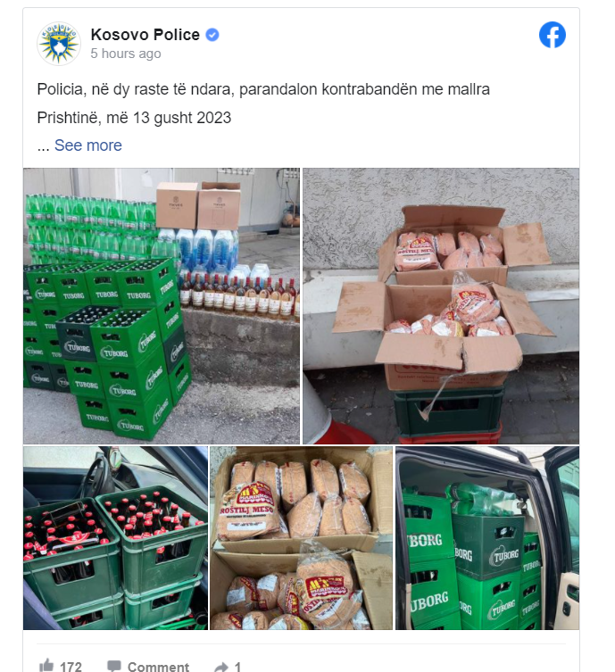 Policia ka arritur ta ndalojë veturën me targa serbe, që drejtohej nga M.S., mashkull serb, në rrugën Muqibabë-Pasjan. Gjatë kontrollit, në veturë janë gjetur mallrat: dy paket mish dhe 640 shishe me birra.