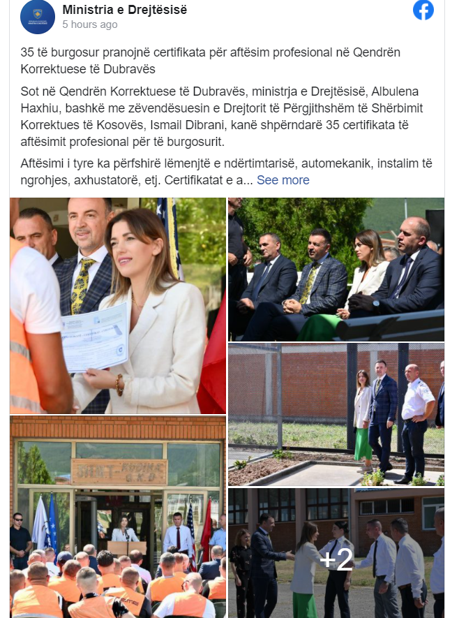 Ministria e Drejtësisë ka njoftuar se në Qendrën Korrektuese të Dubravës, ministrja e Drejtësisë, Albulena Haxhiu, bashkë me zv drejtorin e përgjithshëm të Shërbimit Korrektues të Kosovës, Ismail Dibrani kanë shpërndarë për 35 të burgosur certifikata për aftësim profesional në Qendrën Korrektuese të Dubravës.