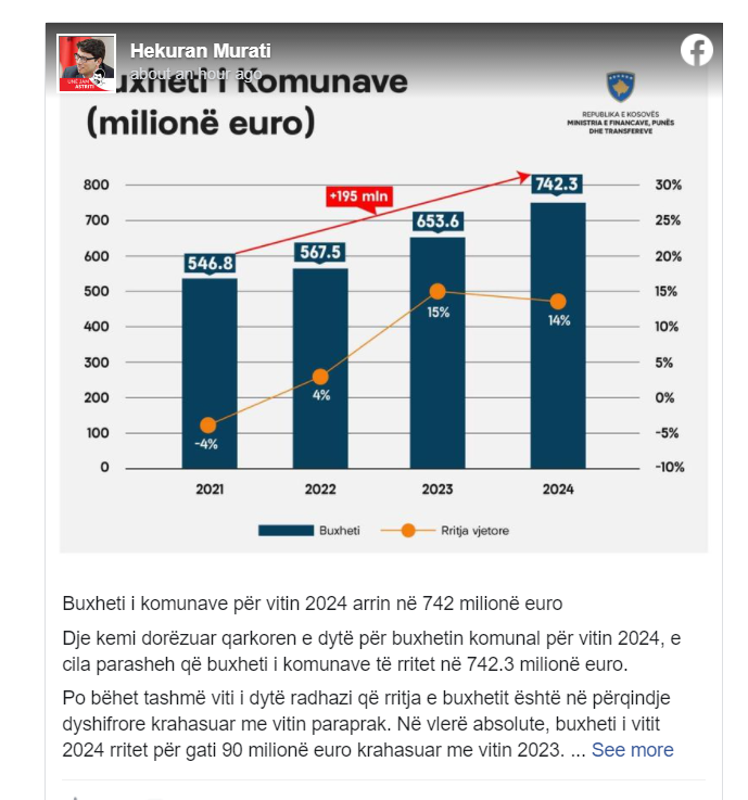 Murati në postimin e tij në Facebook ka thënë se po bëhet tashmë viti i dytë radhazi që rritja e buxhetit është në përqindje dyshifrore krahasuar me vitin paraprak. Në vlerë absolute, buxheti i vitit 2024 rritet për gati 90 milionë euro krahasuar me vitin 2023.