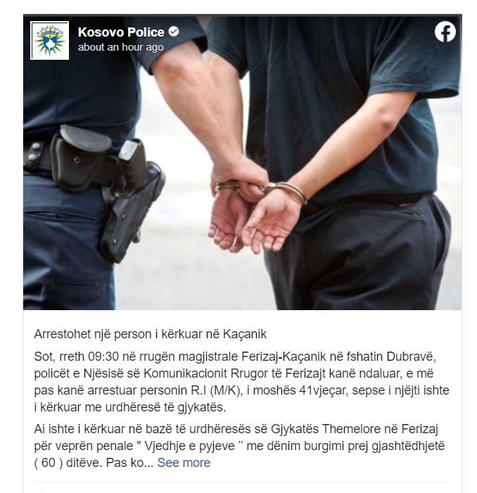 Policët e Njësisë së Komunikacionit Rrugor të Ferizajt, në rrugën magjistrale Ferizaj-Kaçanik në fshatin Dubravë, kanë ndaluar, e më pas kanë arrestuar personin R.I (M/K), i moshës 41vjeçar, sepse i njëjti ishte i kërkuar me urdhëresë të gjykatës.