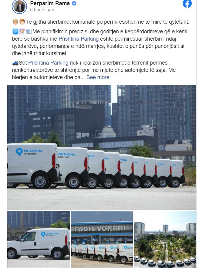 Rama në postimin e tij në Facebook ka thënë se me planifikimin preciz si dhe goditjen e keqpërdorimeve që e kemi bërë së bashku me Prishtina Parking është përmirësuar shërbimi ndaj qytetarëve, performanca e ndërmarrjes, kushtet e punës për punonjësit si dhe janë rritur kursimet. Sot Prishtina Parking nuk i realizon shërbimet e terrenit përmes nënkontraktorëve të shtrenjtë por me mjete dhe automjete të saja, me blerjen e automjeteve dhe pajisjeve tjera të terrenit ka arritur që t’i kursej rreth 1 milion euro për periudhën 2023-2025.