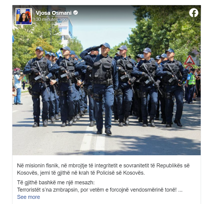 Presidentja Osmani në postimin e saj në Facebook ka thënë se në misionin fisnik, në mbrojtje të integritetit e sovranitetit të Republikës së Kosovës, jemi të gjithë në krah të Policisë së Kosovës.