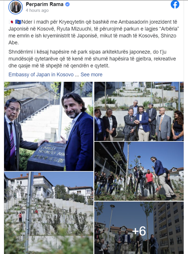 Kryetari i Prishtinës, Përparim Rama ka njoftuar se ka qenë nder i madh për Kryeqytetin që bashkë me Ambasadorin jorezident të Japonisë në Kosovë, Ryuta Mizuuchi, të përurojnë parkun e lagjes “Arbëria” me emrin e ish kryeministrit të Japonisë, mikut të madh të Kosovës, Shinzo Abe.
