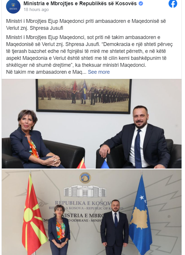 Ministri Maqedonci në takim me ambasadoren e Maqedonisë së Veriut në Kosovë, Jusufi, është diskutuar rreth shumë çështjeve të cilat kanë të bëjnë me fushën e sigurisë dhe mbrojtjes, bashkëpunimin ndërmjet dy shteteve me qëllim ruajtjen e stabilitetit dhe paqes, si dhe reagimit të përbashkët në rast emergjencash civile.
